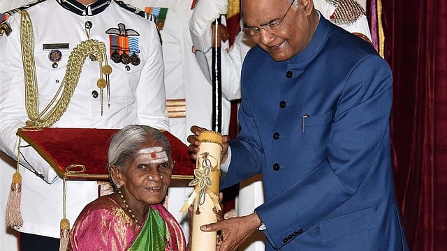 Saalumarada Thimmakka while receiving Padma Shri award from President Ram Nath Kovind GODL-India - Wikipedia